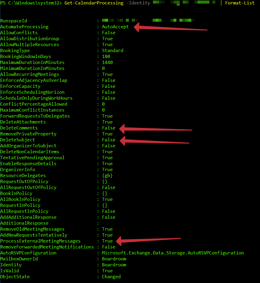 Get-CalendarProcessing -Identity [mailboxEmail] | Format-List